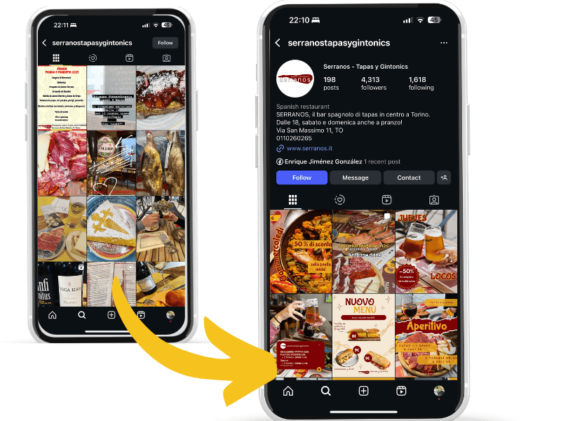 Per Serranos, abbiamo curato la creazione di contenuti visivi e testuali che permettono di far percepire il vibe del ristorante e ovviamente il gusto dei piatti, protagonisti delle immagini.